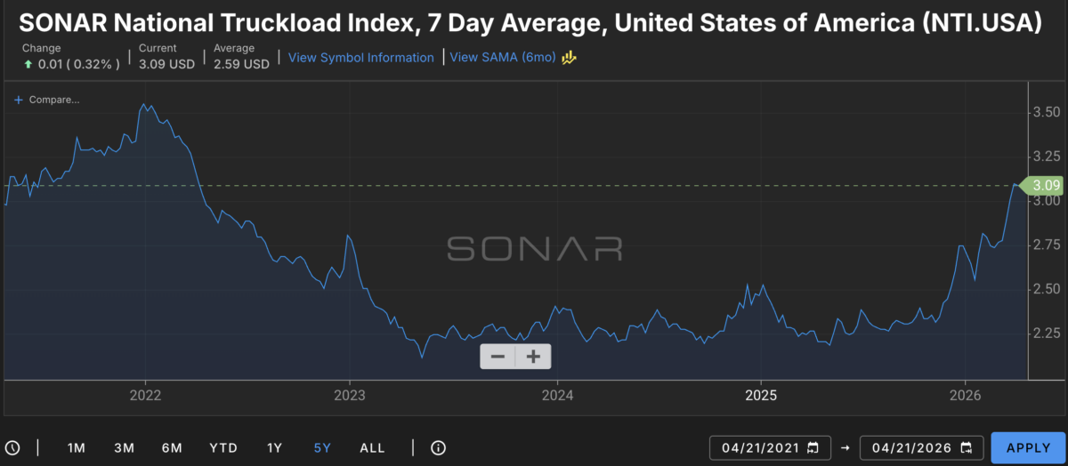 The spot rate per mile on a national basis is sitting at $3.09 as of this week. The six-month average has been $2.59. That $0.50 difference tells you how fast rates have moved. To put it in context: during the worst of the freight recession, rates were running around $2.10. You have come up nearly a dollar per mile from the floor.