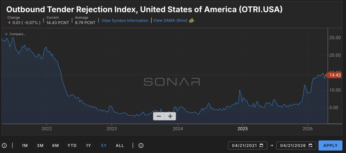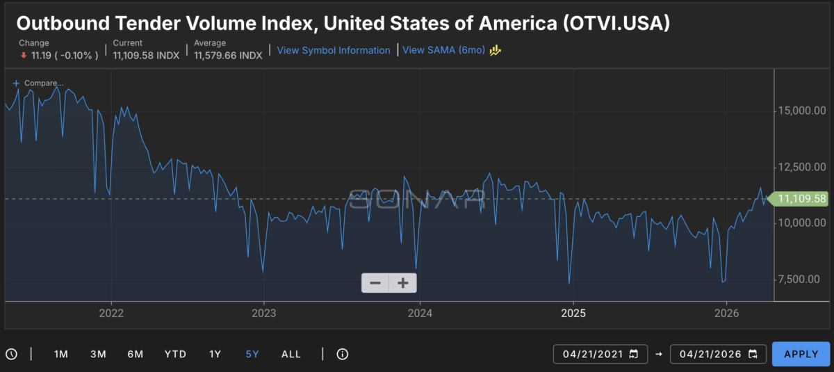 In plain English: there are fewer loads entering the market than there were a month ago. At the same time, there are fewer trucks. Rates are up because trucks are scarce, not because freight is abundant.