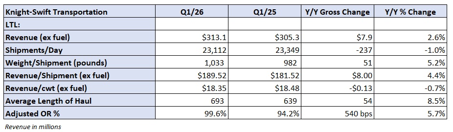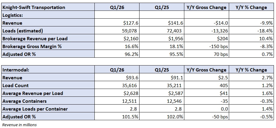 The intermodal unit booked another operating loss. A 101.5% adjusted OR was 140 bps worse sequentially but 50 bps better y/y. Revenue increased 3% as load count and revenue per load “improved progressively throughout the quarter.”