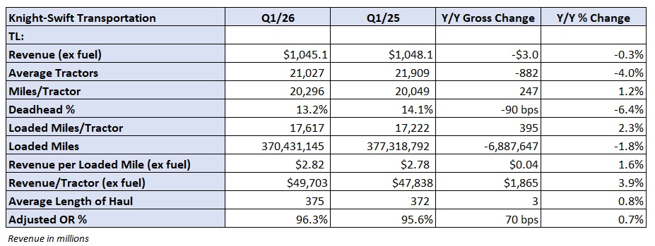 The bulk of the tractor drawdown occurred at the U.S. Xpress fleet, which Knight-Swift acquired in 2023. Total annual revenue at U.S. Xpress is roughly $1.7 billion currently, down from $2.2 billion in 2022, which had the benefit of the tail-end of the upcycle. The actions were taken to improve freight mix and margins. U.S. Xpress is closing the gap to the legacy Knight and Swift fleets, operating at a margin that lagged by 300 bps in the quarter.