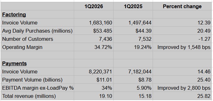 Factoring’s long-term operating margin target is more than 40%; it was 34.7% in the quarter. The Payments EBITDA margin target, excluding LoadPay, is greater than 50%; for the first quarter, it came in at 34%. A year ago it was less than 6%.