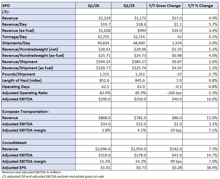 XPO (NYSE: XPO) reported first-quarter adjusted earnings per share of $1.01, which was 13 cents ahead of the consensus estimate and 28 cents higher year over year. The adjusted EPS number excluded transaction and restructuring costs. A lower tax rate was roughly a 5-cent tailwind in the period.